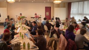 2025年12月3日(水)、恒例のそでがうら歌声サロンが開催されました。今月はフォークソングを中心に活動されているデュオ「プチデリス」のお二人をお迎えし、心温まる歌声と楽しいトークで、会場は終始和やかな雰囲気に包まれました。あいにくの小雨で足元の悪い中にもかかわらず、37名もの皆さまにご参加いただき、会場は満席となりました。年末の気ぜわしい時期ではありますが、皆さんと一緒に歌い、大きな声を出すことで心身ともにリフレッシュできるひとときとなりました。ご参加いただいた皆さまに心より感謝申し上げます。来月も皆さまのお越しをお待ちしております。